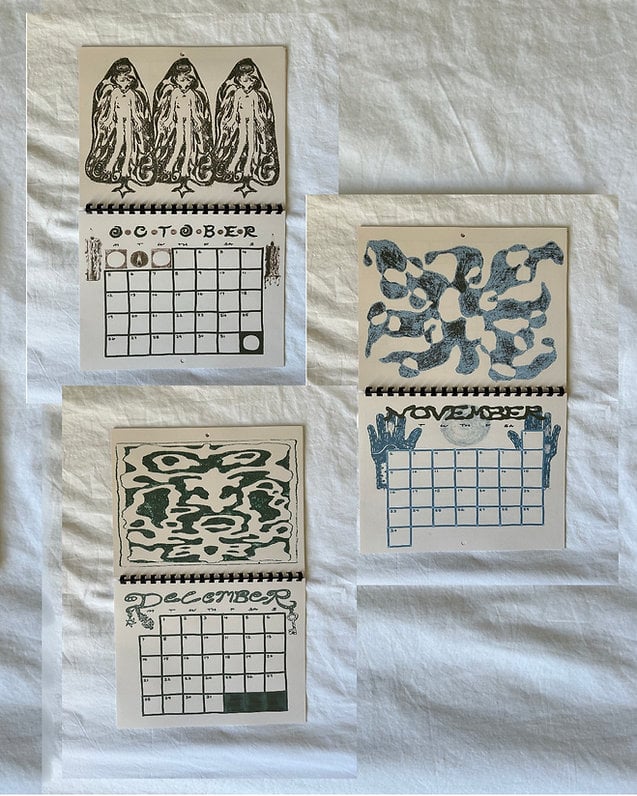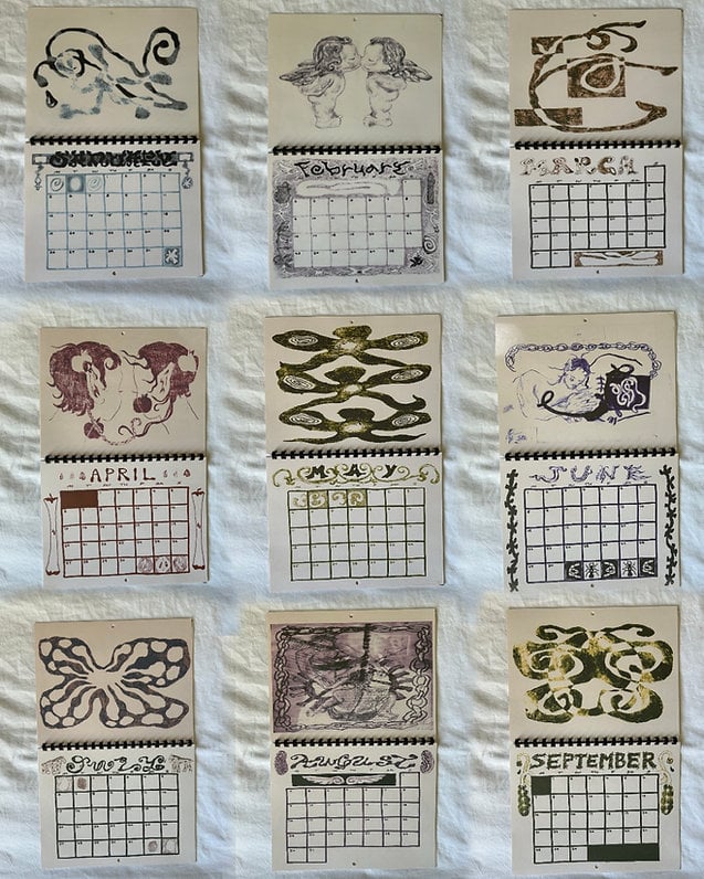 This calendar began not as a product, but as a quiet conversation between my hands and the paper ✋📄. Each drawing started as a monotype—a single, inked impression on a plate, unique and unrepeatable. From those primal marks, characters emerged. Not from trends or algorithms, but from the quiet corners of observation: the way shadows pool in a stairwell, the odd symmetry of cracked pavement, the forgotten grace of a twisted tree branch 🌳🌀.